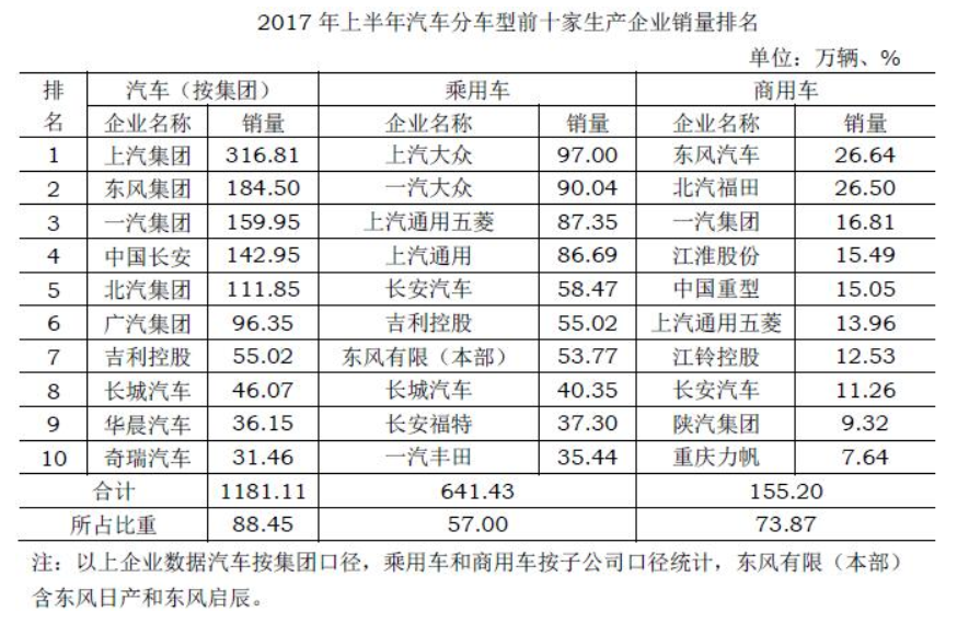 2017年上半年汽車分車型前十家生產企業銷量排名